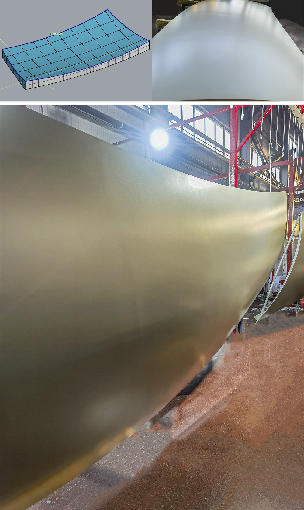 值得一提是的主樓八根香檳色鋁板巨型角柱,該工藝為鋁幕墻制造工藝中最復雜的雙曲,每根柱子由54個雙曲單體構(gòu)成,每個單體面積約8平方,雙曲面經(jīng)過工匠們精心打磨,才成就流暢的單元體線條。難度最大的是,所有拼成柱體的板件尺寸大多為特大1800*6000mm異型板,采用單元板式設(shè)計,每件板超寬、超長,單件板重達130kg,相當于2個成年人的重量。每次鈑金、轉(zhuǎn)序、從噴涂隧道順利噴漆完成,都十分的小心,傾注雅泰所有操作者的心血。